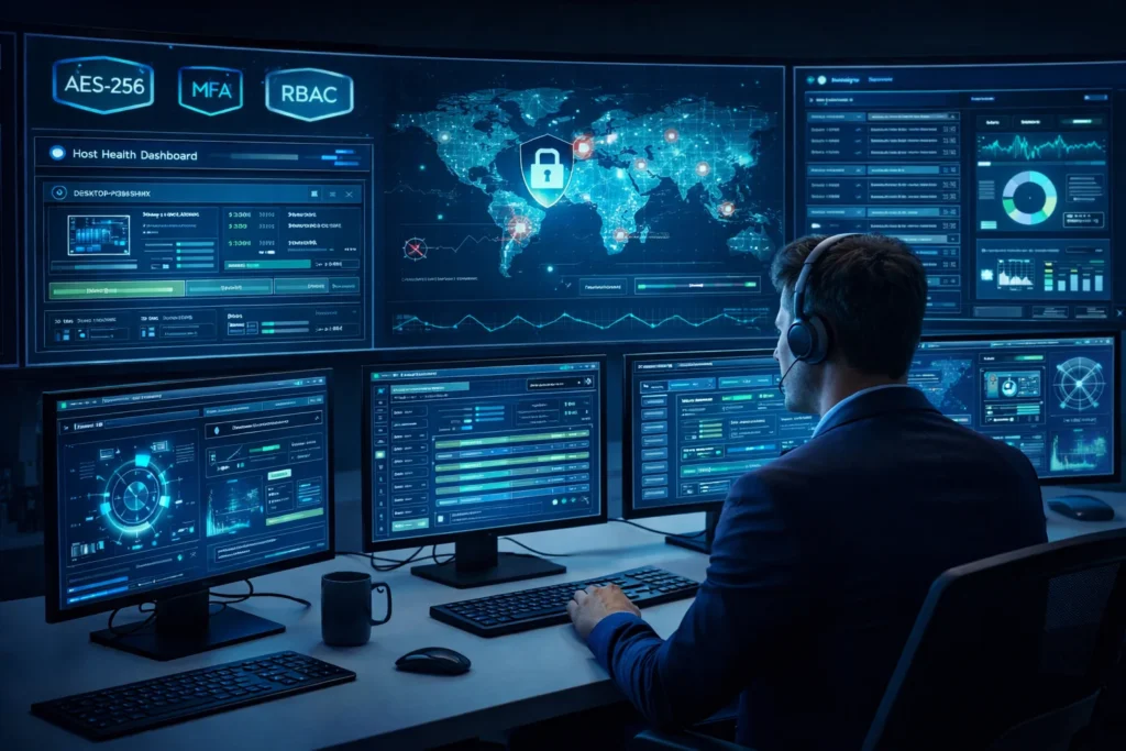 Data sitting on your hosts should be encrypted with AES-256 at the disk level. BitLocker on Windows, LUKS on Linux — set it up and forget about it. If a laptop gets stolen, the data is unreadable without the key.